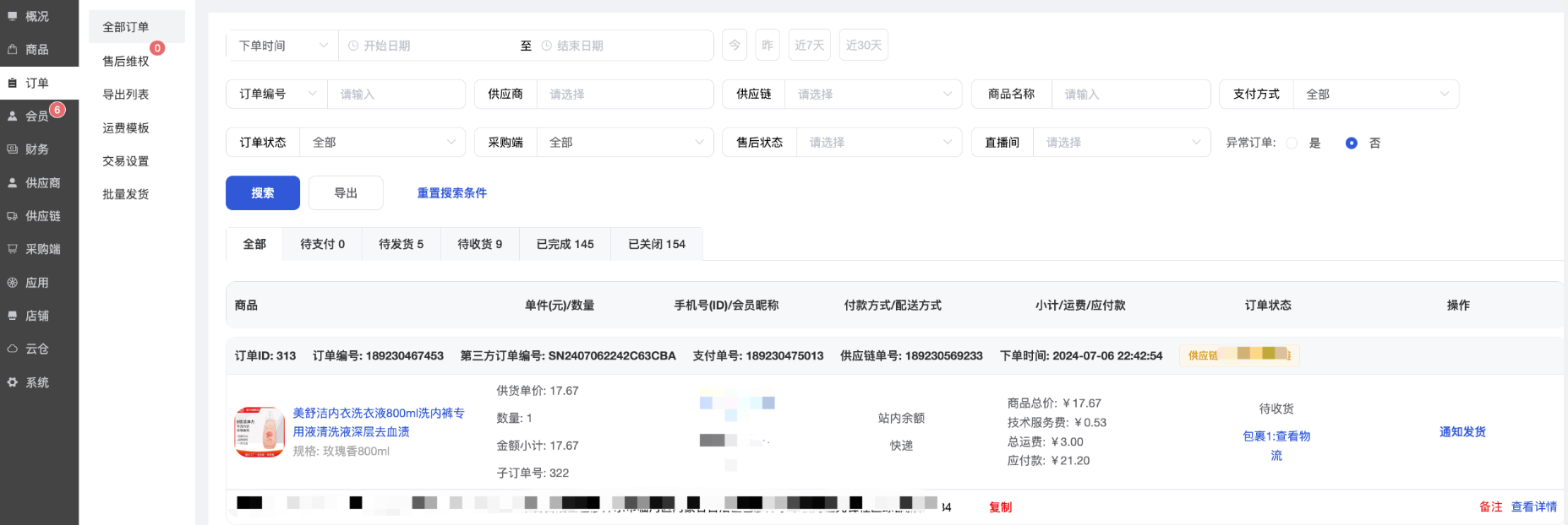(2)供应商:支持筛选平台自营、全部供应商、指定供应商订单;