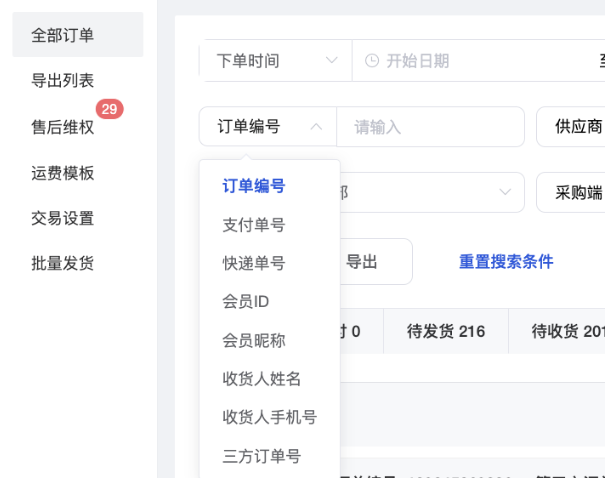 - 第三方订单编号: 采购端中台/商城通过API同步到中台的订单号,常用于查询第三方平台订单;