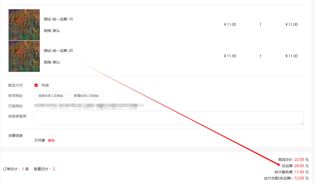 4)统一运费商品,和运费模板商品一同结算:单独计算统一运费商品应收运费,再累加运费模板应收运费;