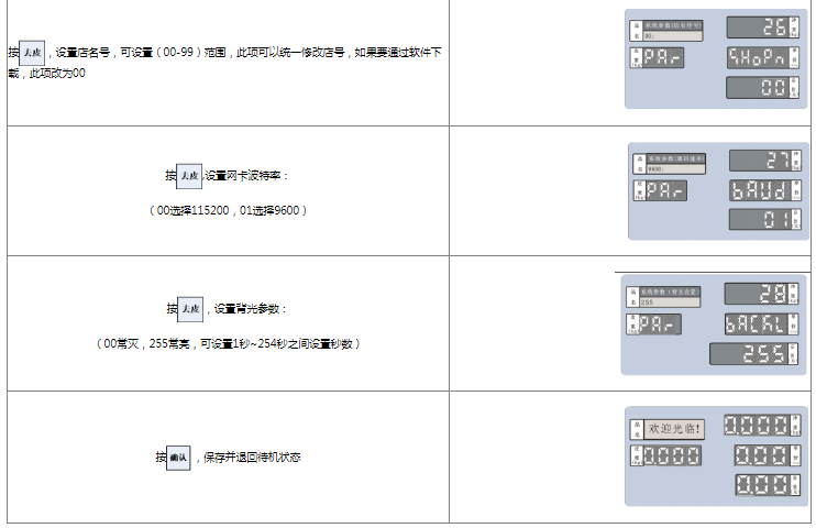阅读本手册时,操作见表格最左列,表格其余列为实施最左列操作后条码打印计价秤各个窗口的显示内容;