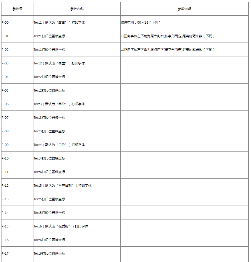 本秤可设置16条汉字文本(编号从1到16)及16条字符文本(编号从17到32),可供每种标签格式任意调用打印;其中1号汉字文本在连续纸状态下为店名。每条汉字文本内容最多可设置30个汉字,每条字符文本内容最多可设置30个字符。(注:汉字文本使用区位码输入;字符文本使用ASCII码输入。)可以用密码4001~4032进入对应的Text文本也可以输入4001~4032中的任意一个密码进入然后按倍数键切换不同的Text文本。