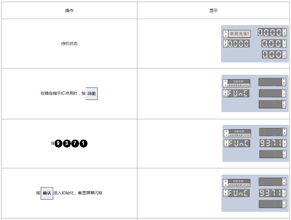 注:此功能将全清电子秤的PLU信息,标签信息,报表信息,及所有相关的设置,且不可恢复,请慎重决定是否使用此功能。