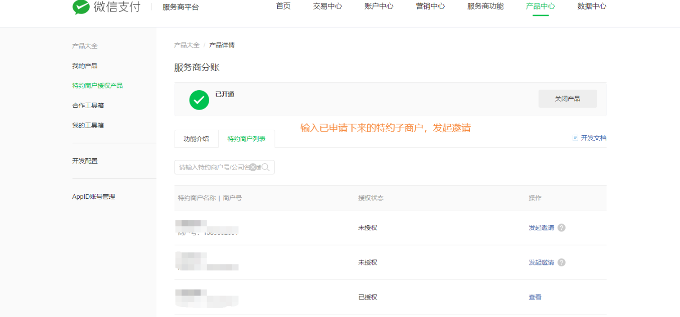 路径:登录服务商商户号 -- 产品中心 -- 服务商分账 -- 特约商户授权产品输入已申请下来的特约子商户,发起邀请,服务商商户号和特约子商户确认邀请授权.