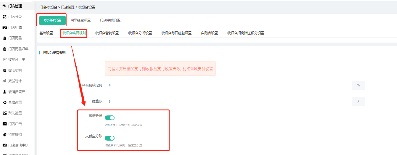 路径:门店收银台--门店管理--操作--收银台结算设置