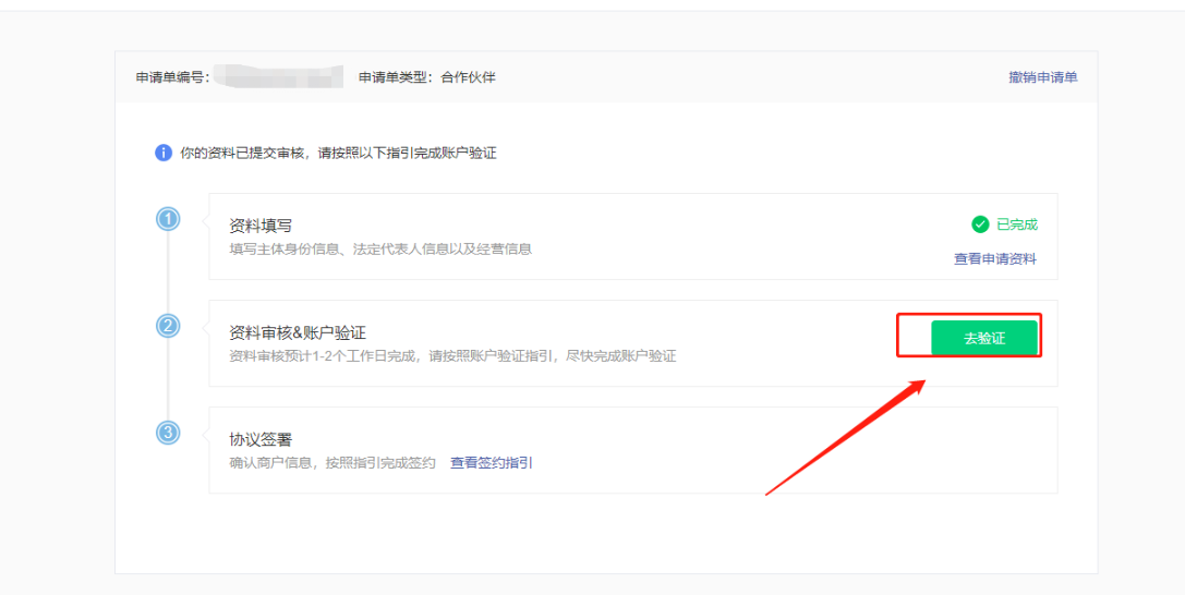 服务商资料填写提交后需要验证账号,点击去验证,有两种验证方式可以选择:1、微信扫码确认 2、申请企业账户汇款