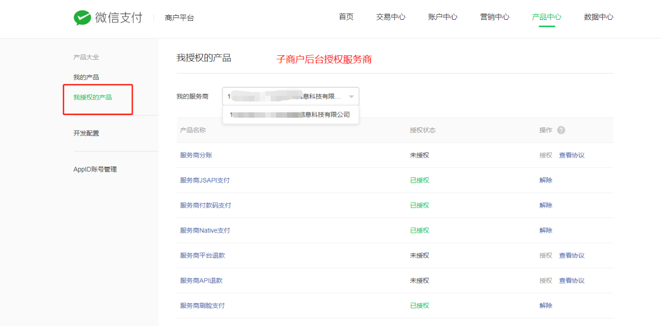 等特约子商户申请下来后,下一步请登录子商户后台pay.weixin.qq.com,并在产品中心--我授权的产品--选择关联的服务商,授权服务商分账功能。