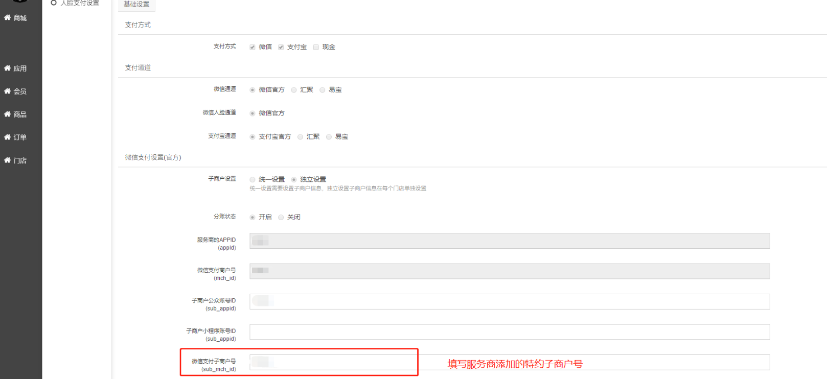 路径:门店独立后台 -- 应用 -- 人脸支付设置中设置特约子商户信息。