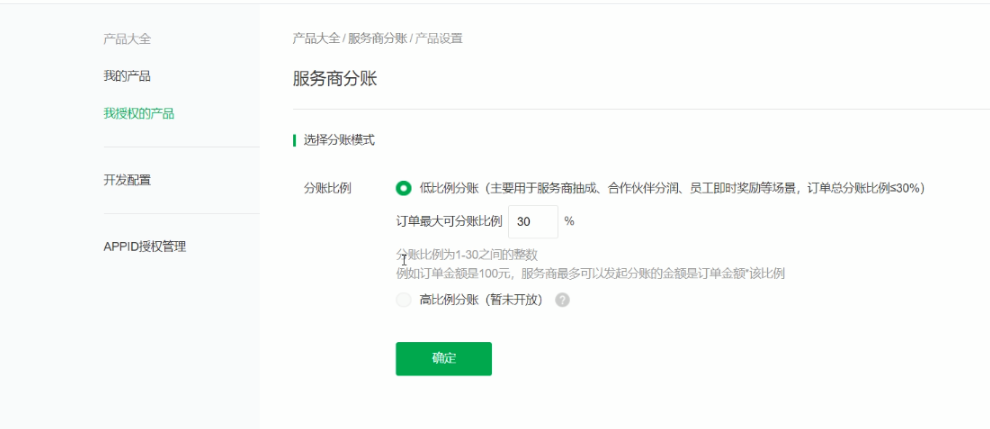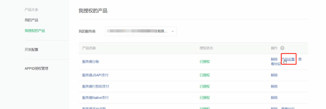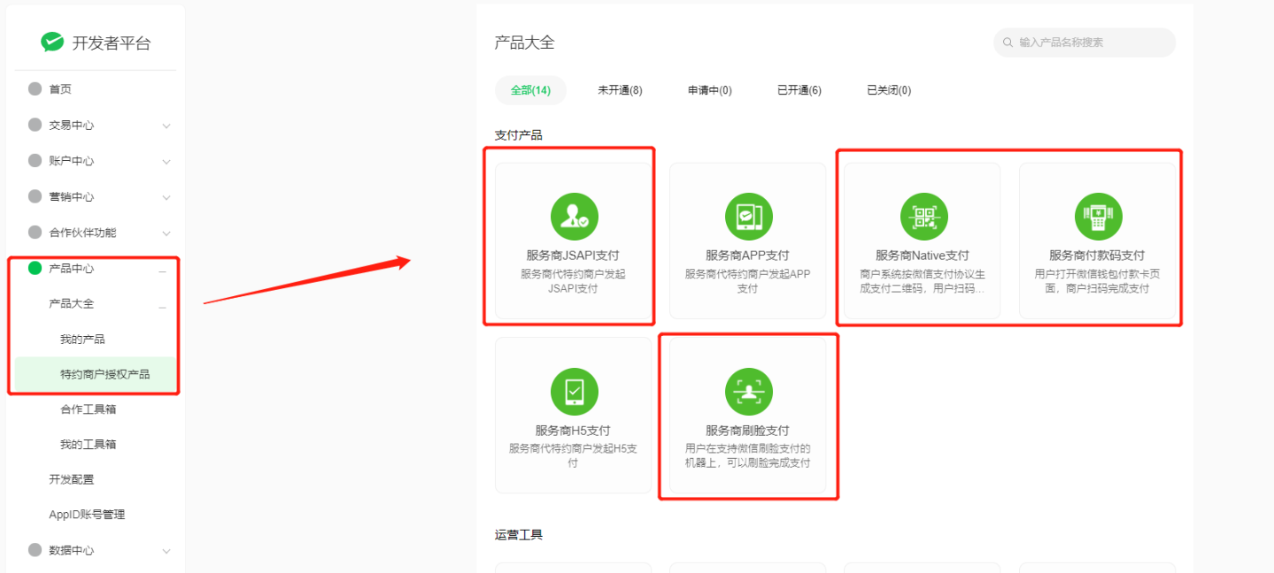 3、服务商的特约商户授权产品要开通服务商JSAPI支付、服务商native支付、服务商扫码支付(即付款码支付)、服务商刷脸支付、服务商分账。