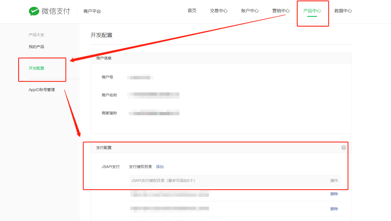 1、路径:微信商户平台(pay.weixin.qq.com)-- 产品中心 -- 开发配置 -- 支付配置--JSAPI支付,添加支付授权目录。