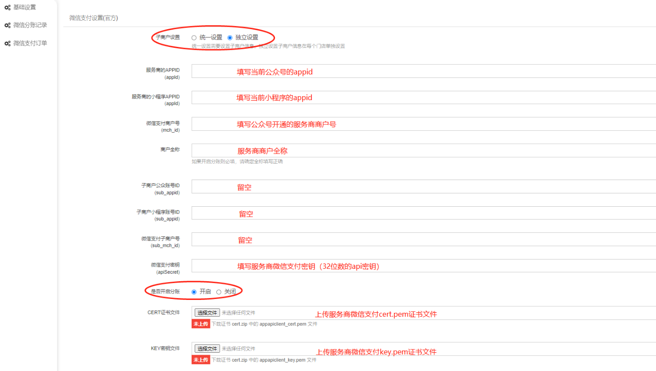 CERT证书文件:务必上传服务商的微信支付证书文件