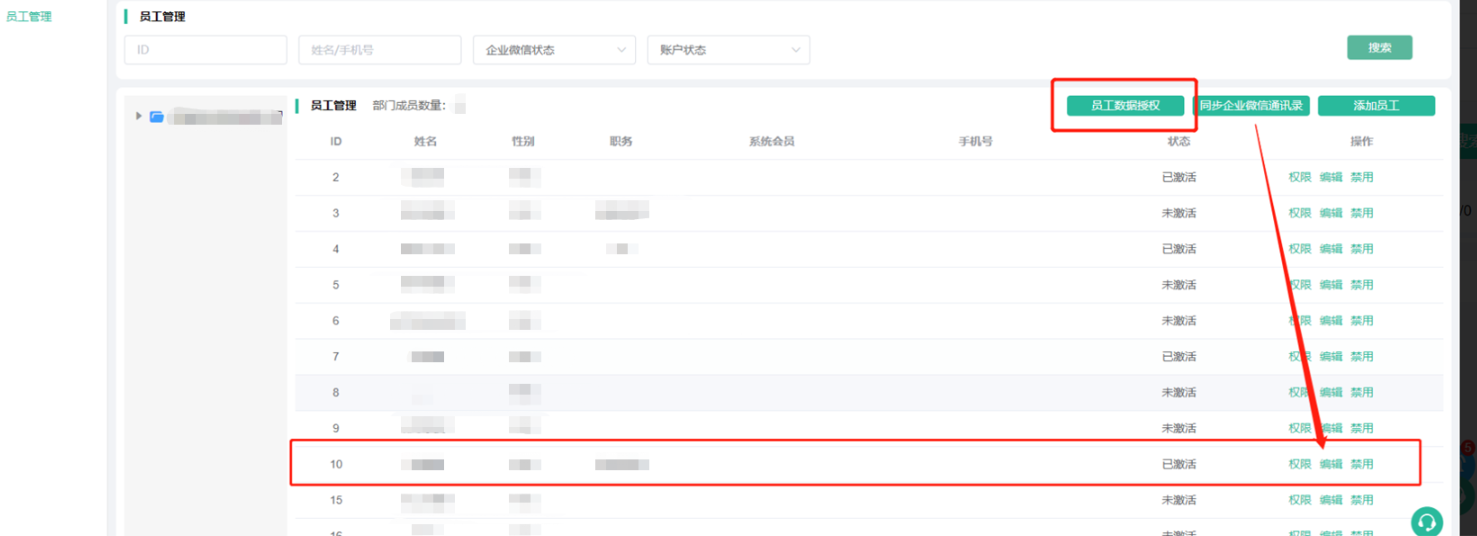 处理方法:在成员管理点击员工数据授权,让对应员工扫码授权后才可以编辑。若授权成功后,还出现同样提示,请更新商城站点,再去走一遍数据授权步骤.