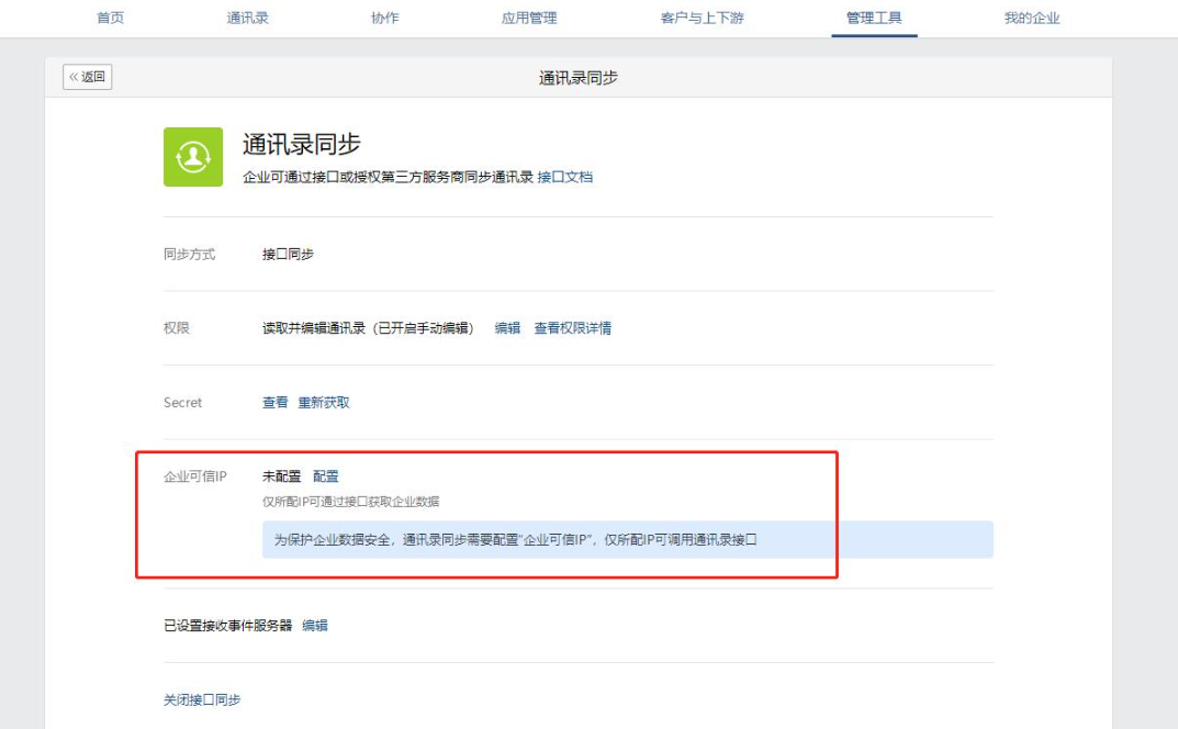 处理方法:企业微信官方后台 -- 管理工具 -- 通讯录同步 -- 企业可信ip 添加下自己站点服务器ip.