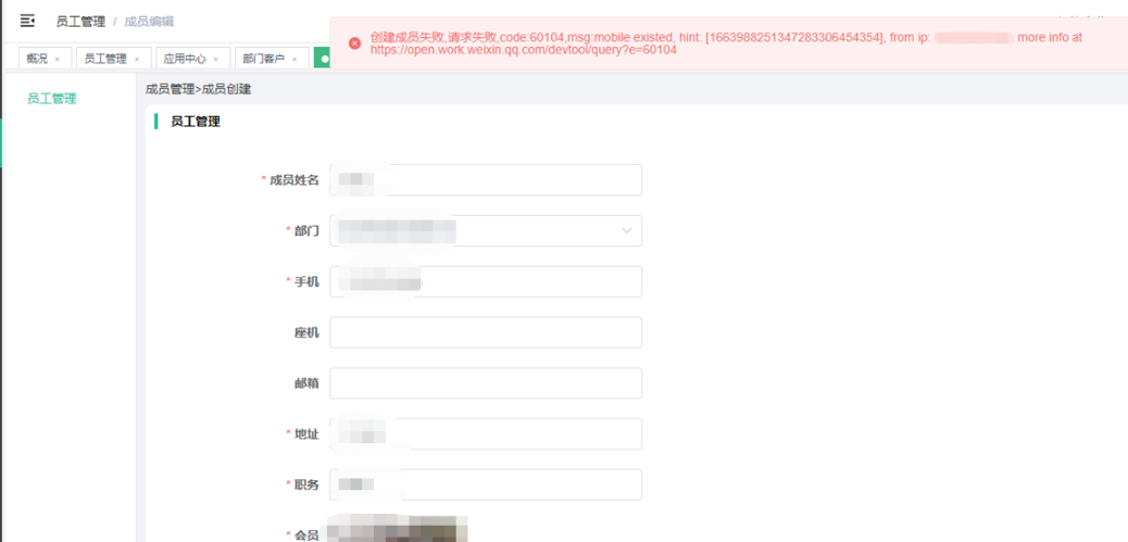 问题1、添加员工“提示创建成员失败,请求失败,code:60104,msg:mobile existed, hint: [1663989122372882910813006], from ip: xxxxxxx, more info at https://open.work.weixin.qq.com/devtool/query?e=60104”