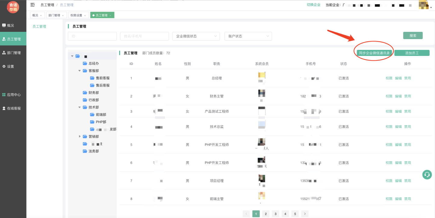 在同步企业微信员工之前,请必须先在部门管理中同步企业微信部门。