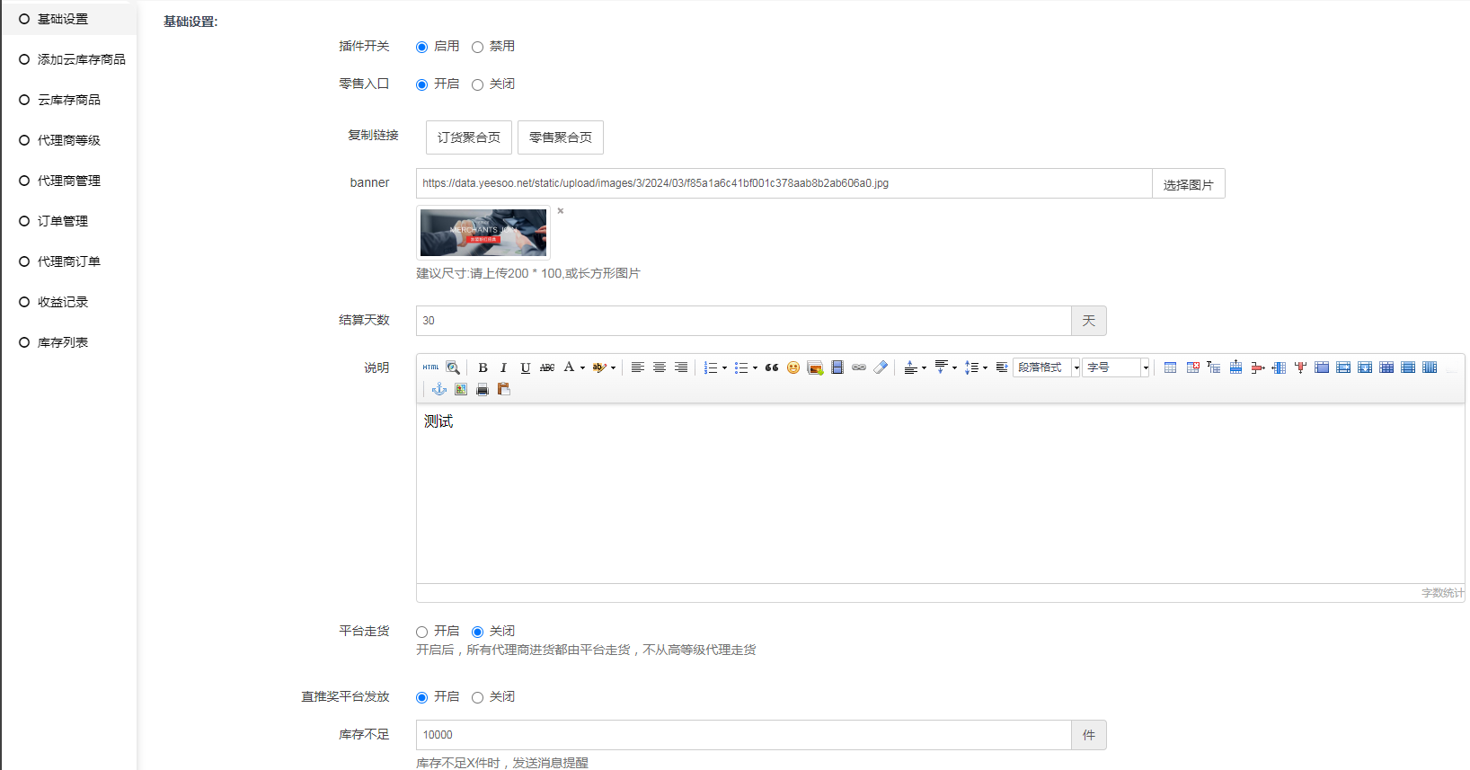 聚合页链接:点击按钮进入前端,前端页面显示后台banner图片和云库存商品信息