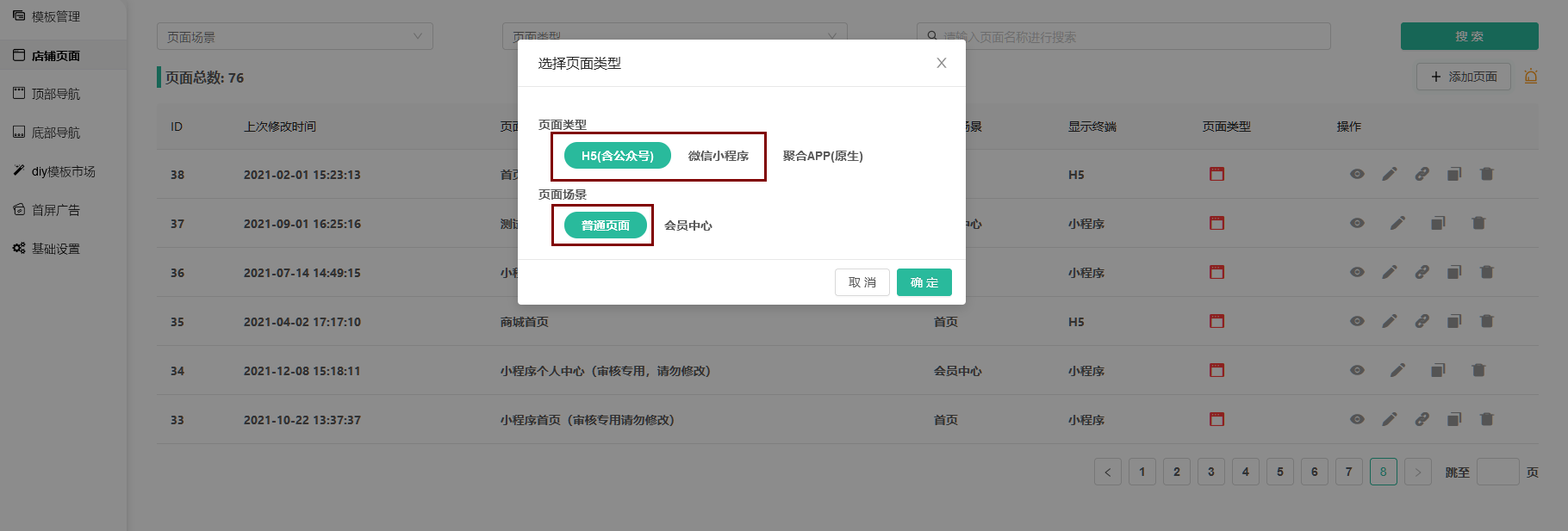 2、装修DIY--添加页面--H5(含公众号)/微信小程序中选择模板创建聚合CPS H5、小程序页面,如下图: