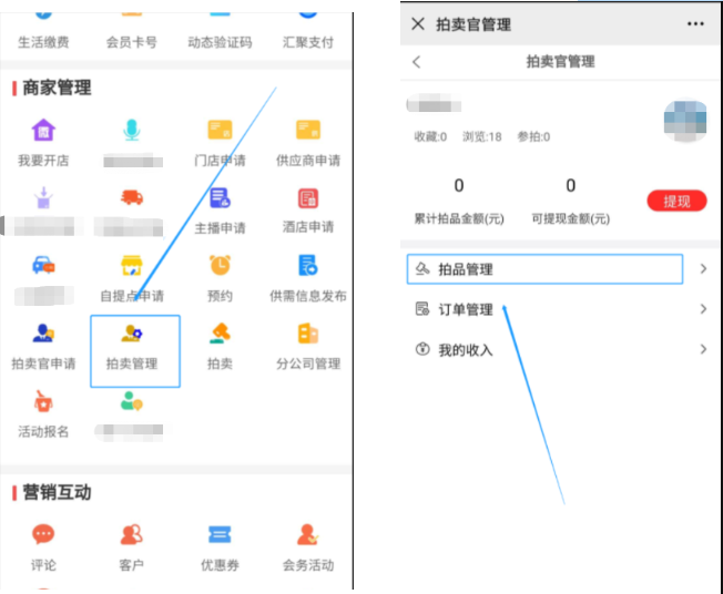 点击进入拍卖官店铺管理页面,拍品管理、订单管理、我的收入