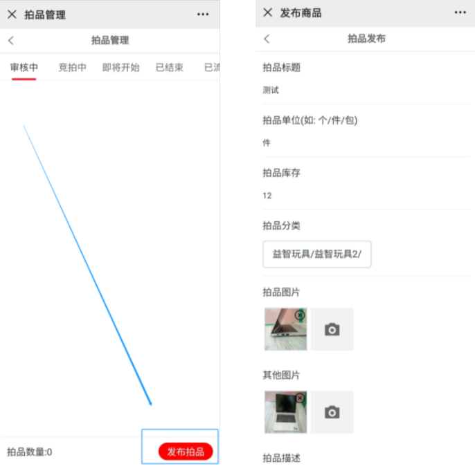 拍卖官申请入口,点击进入拍卖官申请页面,如未购买指定商品,会跳转到指定商品详情页,并提示“请先购买指定商品”,购买完成后再次进入拍卖官申请页,填写信息提交申请;