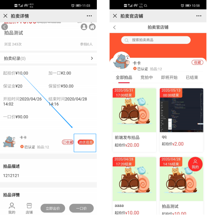 商品详情页点击“进店逛逛”按钮,进入拍卖官店铺,可以浏览改拍卖官店铺的所有商品