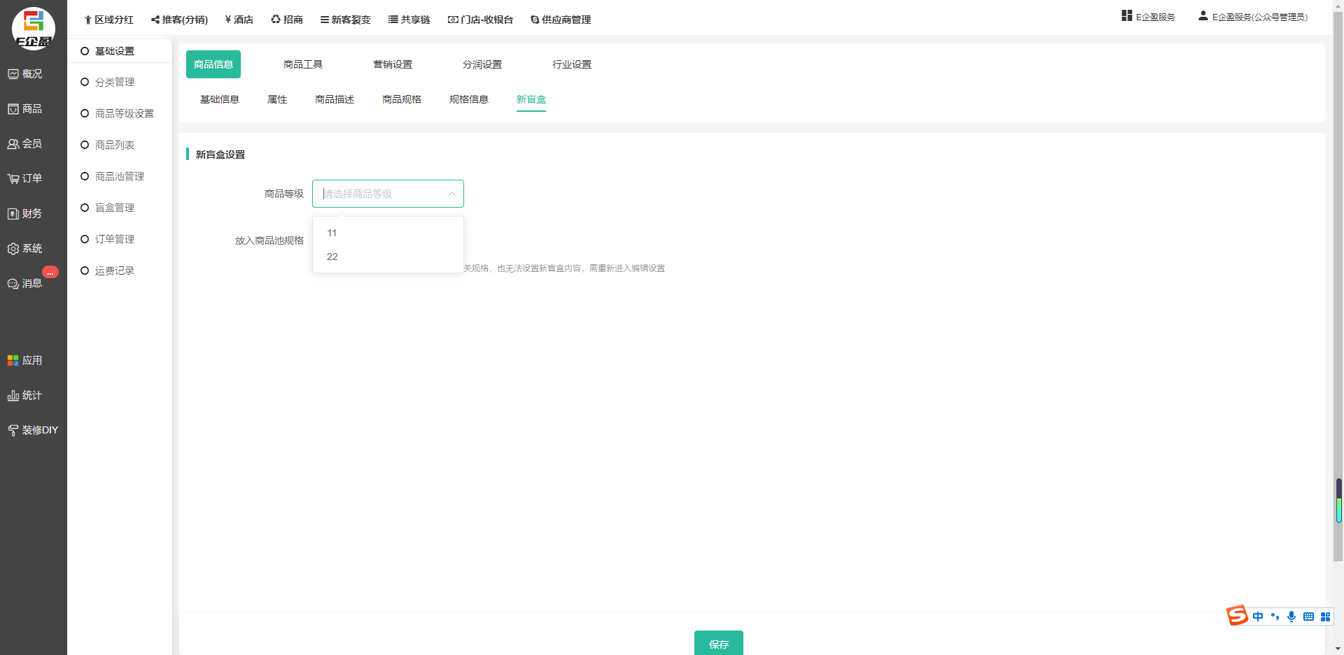 3. 商品编辑时可选择盲盒商品等级,若商品有规格,则还需要选择规格