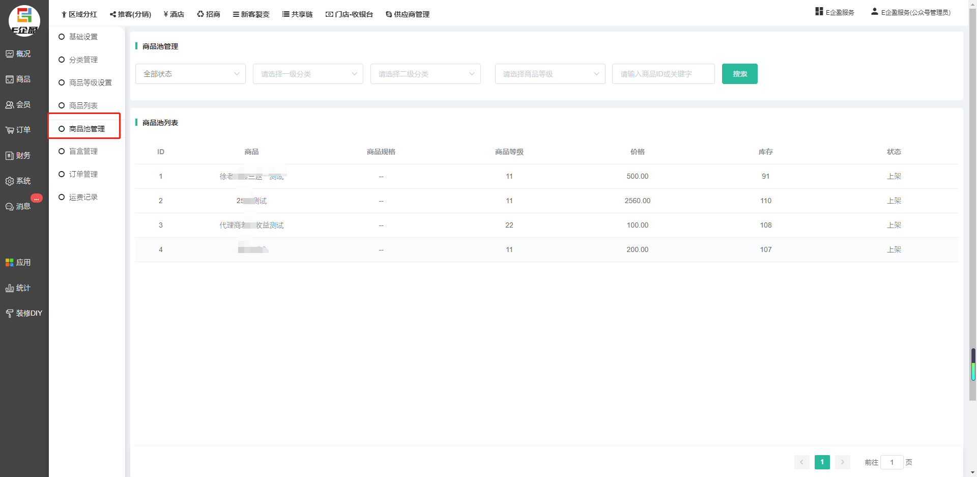 设置了商品等级的商品才会显示;显示商品名称、商品规格、商品等级、价格、库存、上架状态
