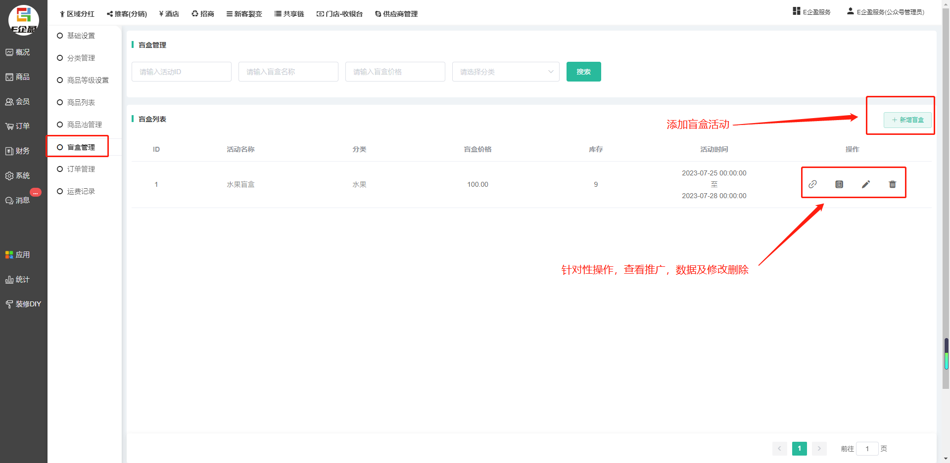 1) 添加盲盒,设置盲盒名称、盲盒分类、商品等级、购买该盲盒所需选择的商品数量,盲盒图片,盒子图片,活动时间
