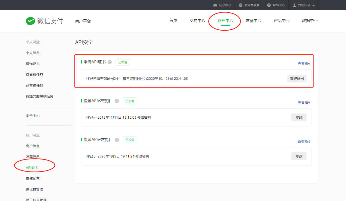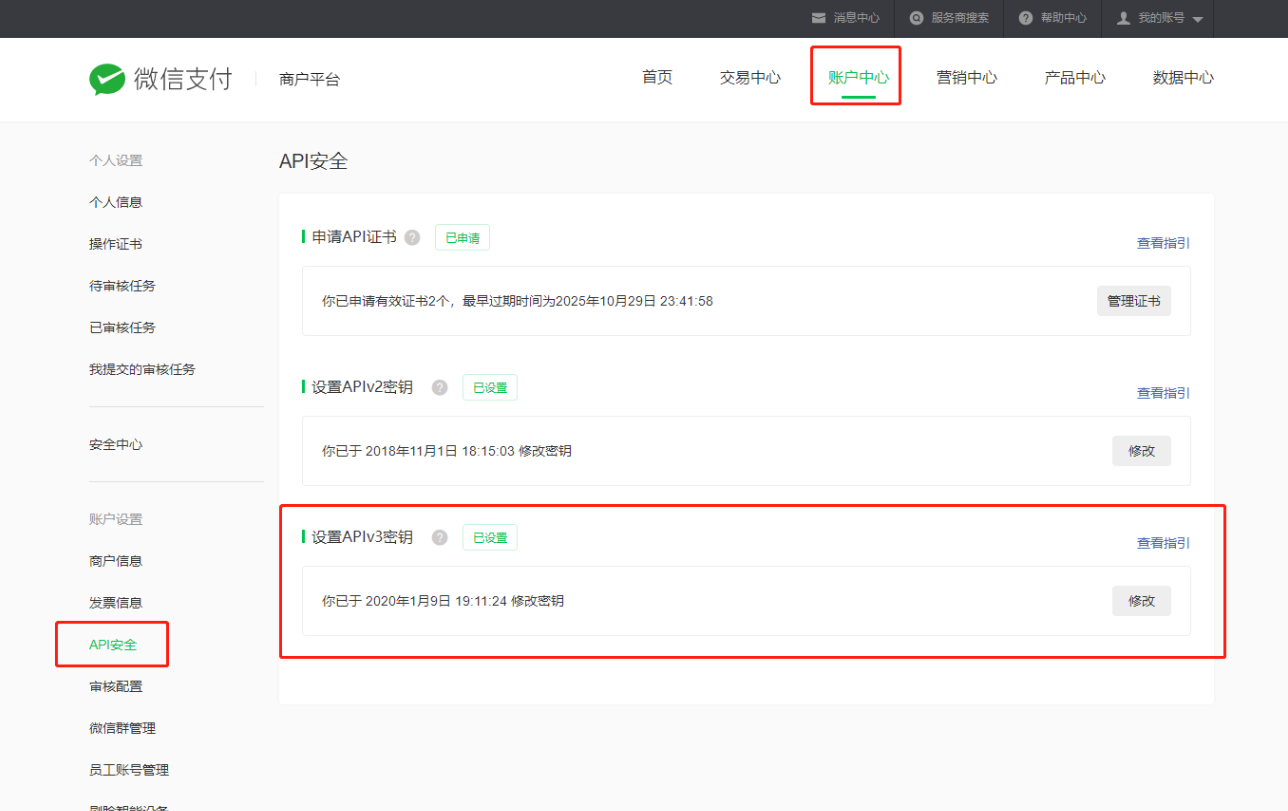 (三)配置微信商户平台 -- 账户中心 -- API安全 -- 设置APIV3密钥