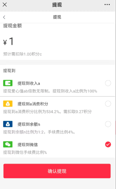 爱心值提现--后台是不需要审核的,公众号、小程序这里会有个入口,点击进去显示提现记录