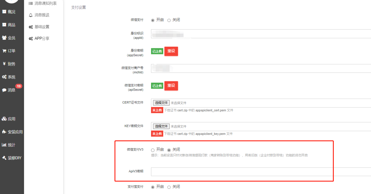(一)商城后台 -- 系统 -- 支付方式 -- 开启微信支付-V3新版开关,并填写相关配置;